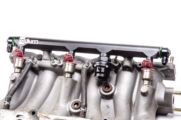 The Radium Engineering high flow secondary fuel rail is for the OEM lower intake manifold found on the Mazda 20B-REW rotary engine. The aluminum fuel rail is anodized black for compatibility with all popular fuel types including E85. Manufactured with a large internal bore, the fuel rail can support all necessary engine power requirements. Like the stock fuel rail, the rail features 11mm injector bores permitting the use of OEM fuel injectors (shown below).