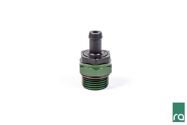 Radium PCV valve for positive crankcase ventilation systems. Can be used on the outlet of any Radium Engineering Catch Can. or any related part that uses -10AN ORB threads.